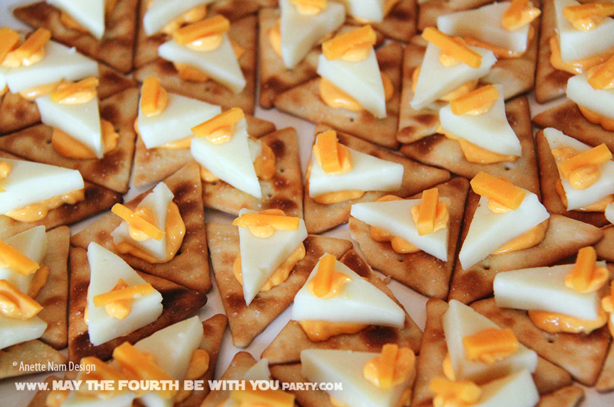 - Spray a tiny dab o’cheese on each cheese rectangle, and add it to the stern of each Imperial Star Destroyer.