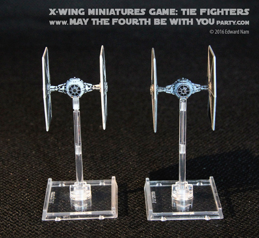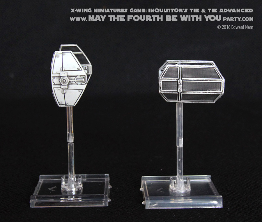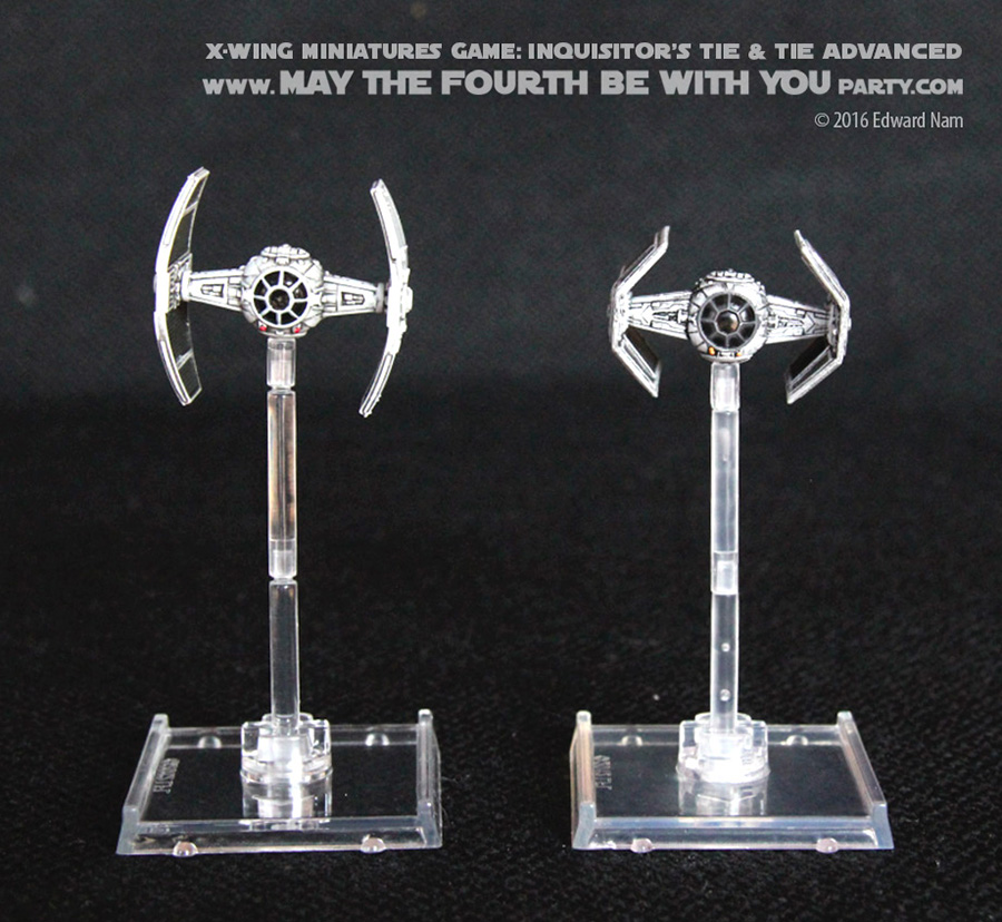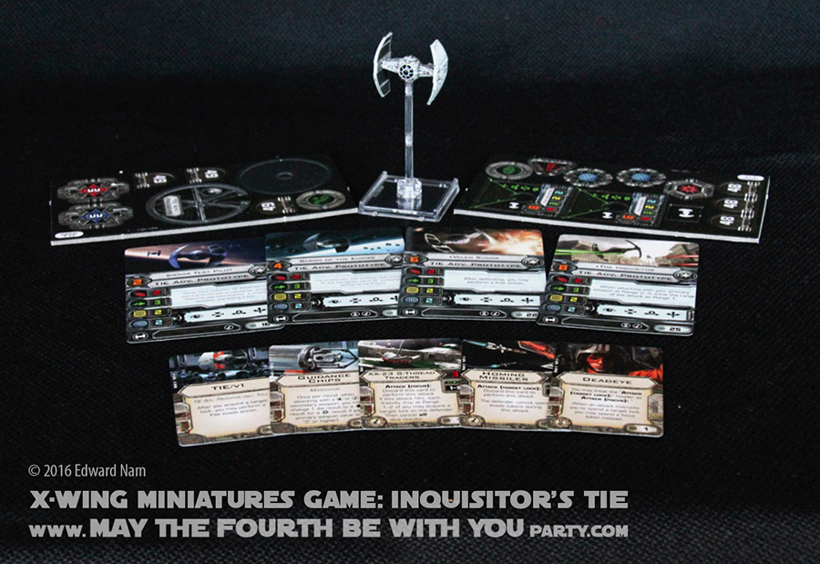Comparing abilities, the Inquisitor’s TIE has the same four action choices: focus, barrel roll, target lock, and boost. The pilot skill value options on the four Inquisitor cards included are 2, 4, 6, and 8 with squad point costs of 16, 19, 22, and 25 respectively. The standard TIE Advanced has 2, 4, 7, and 9 pilot skill level with squad point costs of 21, 23, 27, and 29 respectively. The squad points are cheaper because the hull value is one point lower (2 vs 3). So the Inquisitor’s TIE is slightly weaker than Darth Vader’s variant.