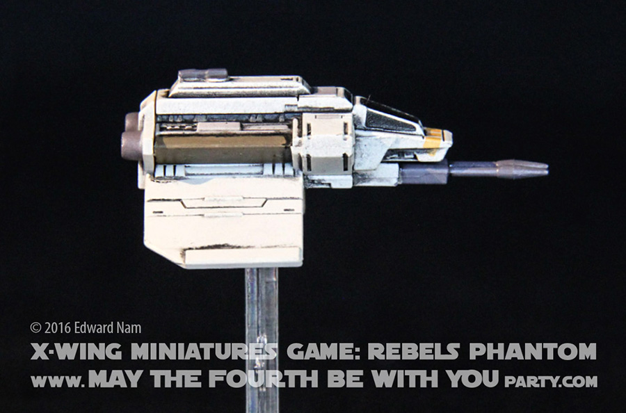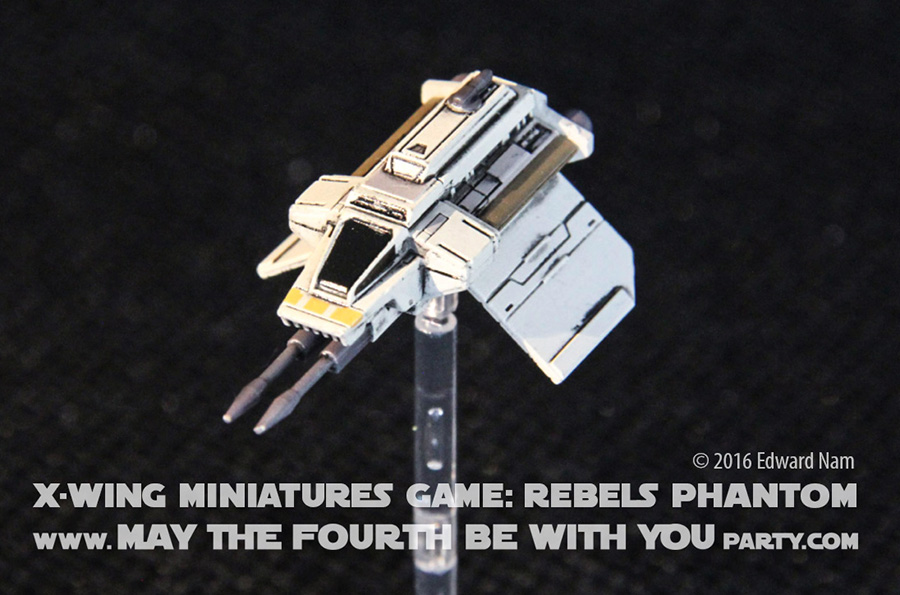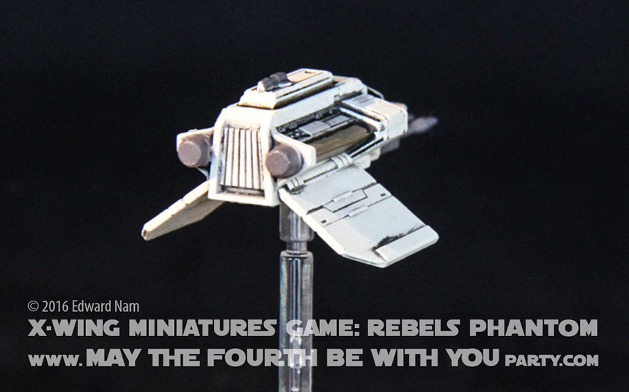 The Phantom has 3 action choices: focus, barrel roll, and evasion. It has the following stats: 3 firepower, 2 agility, 2 hull, 2 shield; and 3, 4, 5, 7 pilot skill levels for 18, 20, 21, 22 squadron points respectively signifying Zeb, Ezra, Sabine, and Hera as pilots. If you want the Ghost to fire from the Phantom in the rear, you have to “buy” the shuttle too. There are specific rules for how the Phantom can deploy during combat.
