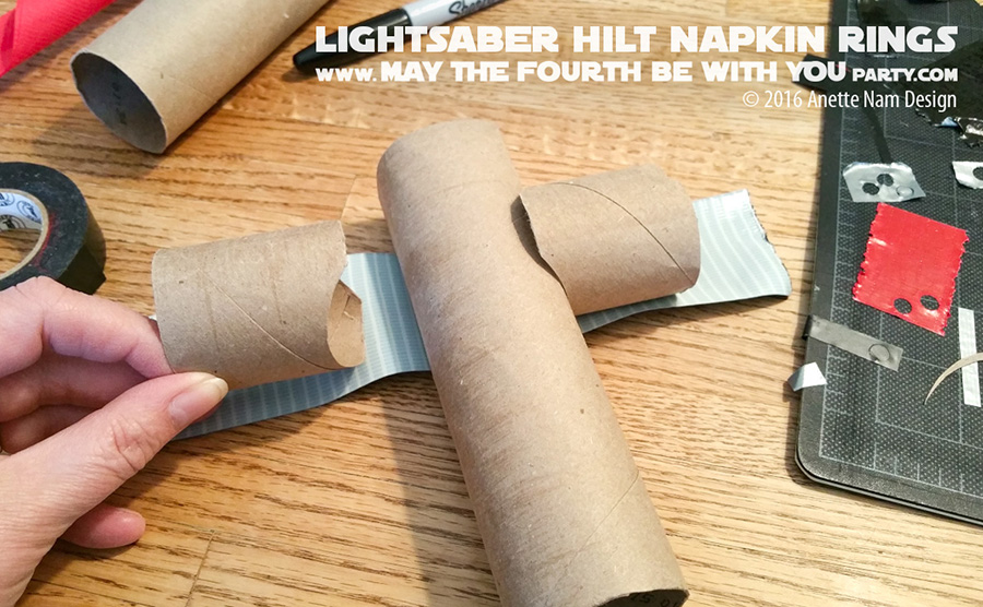 Today, we are doing a simpler version of the Lightsaber Hilt Napkin Rings. This easier version requires less time, less mess, and less sharp tools… but is just as much fun to make…maybe even more so. ‘Cuz who doesn’t enjoy doing crafts with paper towel rolls and Duct tape 🙂