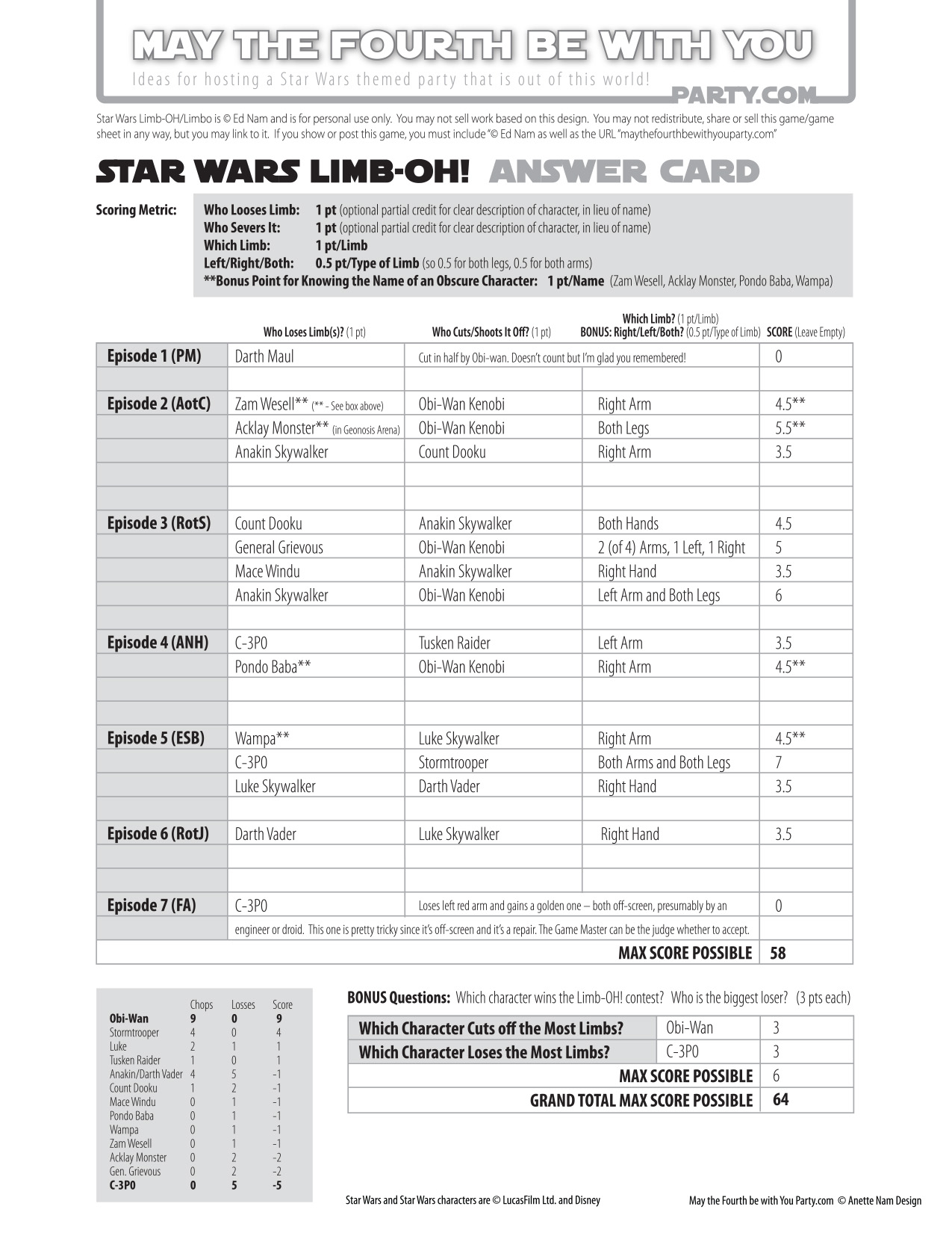 “Limb-OH!” is of course a play on words, after all, I am also the “pun master” around here. The premise of the game is to accurately answer these questions about Star Wars I-VII: