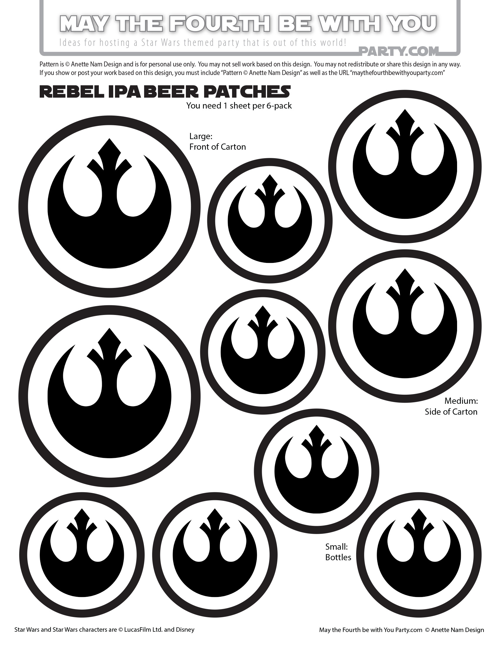 Red 5 Mom (GREAT blog name!) shared her ideas for her May the Fourth Party, and she used Samuel Adams Rebel Rouser IPA as the adult beverage of choice. BRILLIANT! So I went to a local grocery store (with the largest beer selection around), and though they didn’t have Rebel Rouser, they did have Rebel IPA. I bought a few 6-packs, and made Rebel insignia graphics to cover up the big hops on the case and the bottle labels. (You can download the “Patch” [with sized graphics], from the bottom of this post).